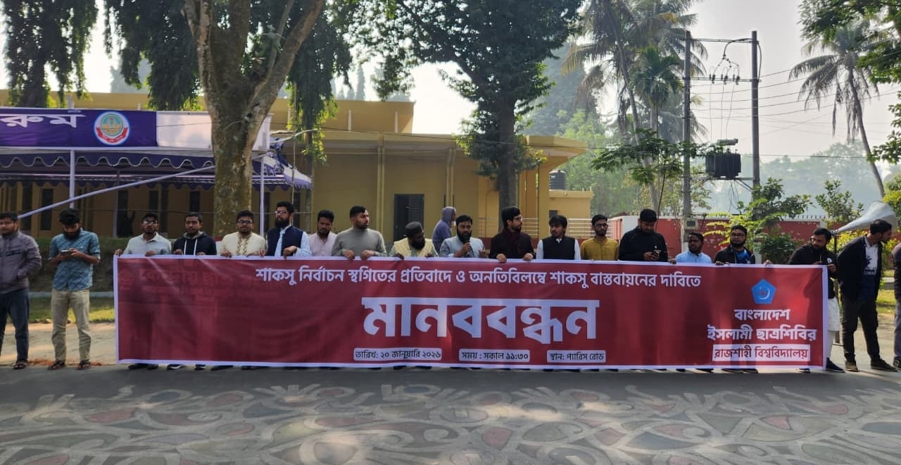 শাকসু নির্বাচন স্থগিতের প্রতিবাদে রাবিতে ছাত্রশিবিরের মানববন্ধন, অবিলম্বে নির্বাচনের দাবি