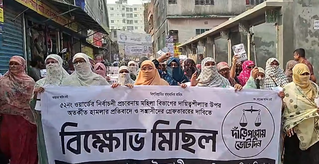 ঢাকা-৪ আসনে দলীয় প্রার্থীর পক্ষে গণসংযোগকালে জামায়াতে ইসলামীর নেত্রী কাজী মারিয়া ইসলাম বেবির ওপর অতর্কিত হামলার প্রতিবাদ ও জড়িতদের গ্রেপ্তারের