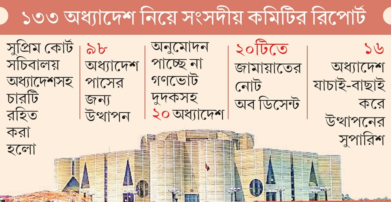 অন্তর্বর্তীকালীন সরকারের সময়ে জারি করা ২০টি অধ্যাদেশ বর্তমান অধিবেশনে অনুমোদিত হচ্ছে না। এর মধ্যে বিচারপতি নিয়োগ সংক্রান্ত ক্ষমতা, গণভোট, দুর্নীতি