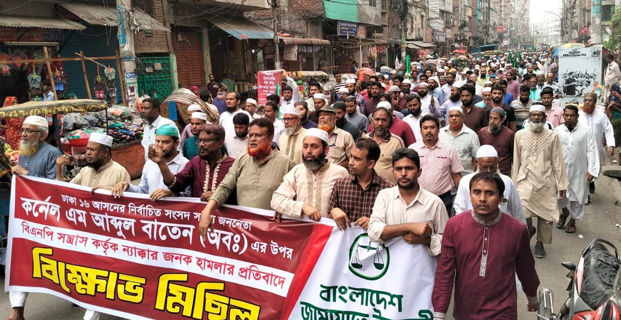 ঢাকা-১৬ আসনের সংসদ সদস্য অবসরপ্রাপ্ত কর্নেল আব্দুল বাতেন এবং তার নেতা-কর্মীদের ওপর হামলার প্রতিবাদে জামায়াতে ইসলামী একটি বিক্ষোভ মিছিল করেছে।