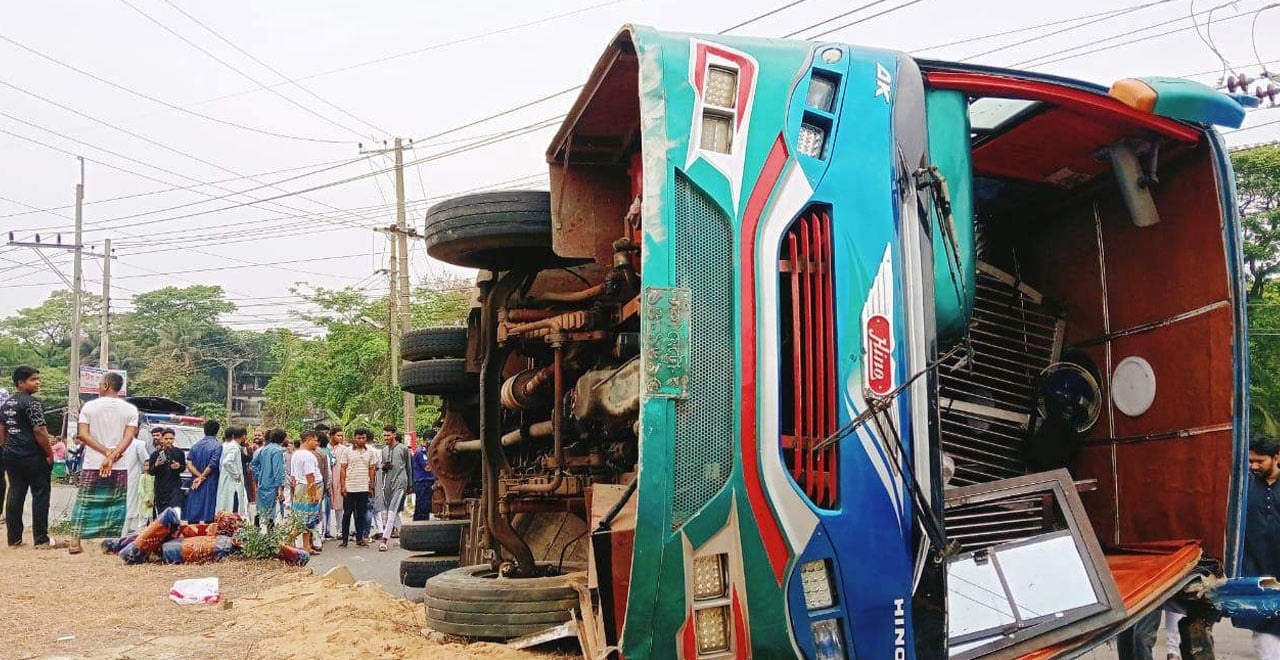 পথচারীকে বাঁচাতে গিয়ে নিয়ন্ত্রণ হারিয়ে বাস উল্টে নিহত ১, আহত ২০