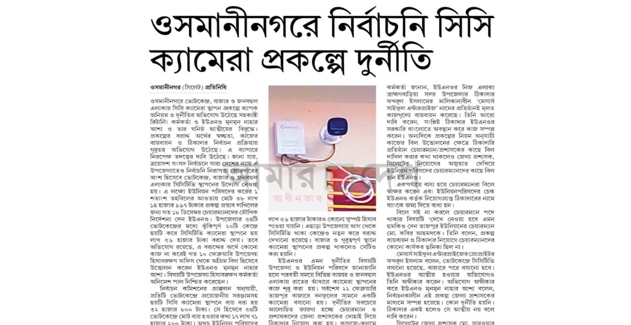 সিলেটের ওসমানীনগরে নির্বাচন সংক্রান্ত একটি সিসি ক্যামেরা স্থাপন প্রকল্পে ব্যাপক দুর্নীতি ও স্বজনপ্রীতির অভিযোগ উঠেছে। সম্প্রতি একটি জাতীয় দৈনিকের অনুসন্ধানী