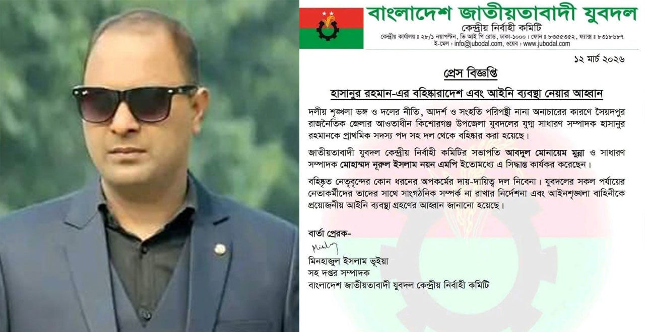 পছন্দের ঠিকাদার কাজ না পাওয়ায় এক স্বাস্থ্য কর্মকর্তাকে হুমকি দেওয়ার অভিযোগে উপজেলা যুবদলের যুগ্ম সাধারণ সম্পাদক হাসানুর রহমানকে দল থেকে