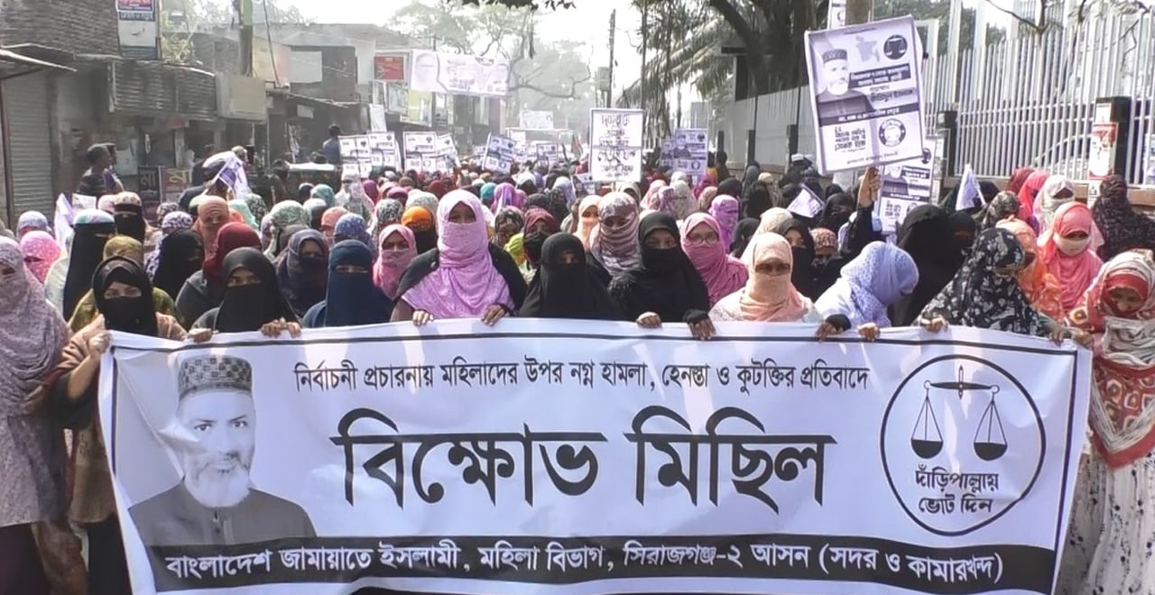 নির্বাচনি প্রচারে নারী হেনস্তার প্রতিবাদে সিরাজগঞ্জে মহিলা জামায়াতের বিক্ষোভ