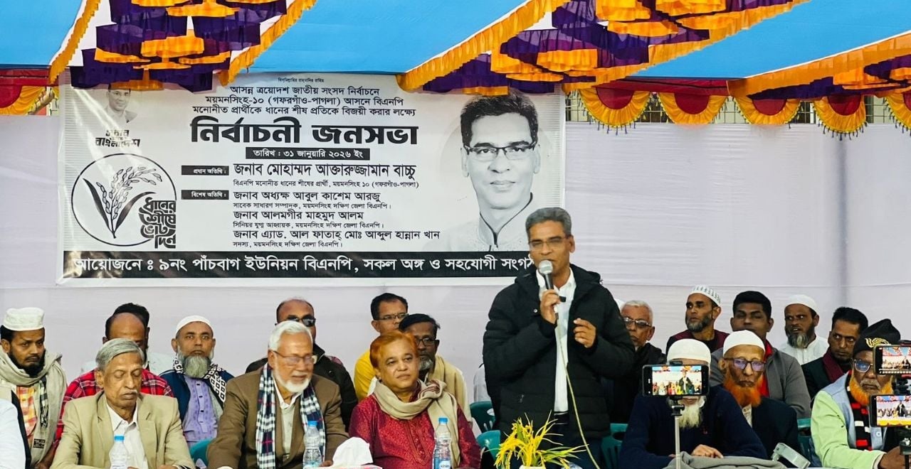 ময়মনসিংহ-১০ (গফরগাঁও) আসনে ধানের শীষ প্রতীকের এক নির্বাচনী জনসভায় প্রার্থী মোহাম্মদ আক্তারুজ্জামান বাচ্চু সন্ত্রাস, দুর্নীতি ও মাদকমুক্ত উপজেলা গড়ার দৃঢ়