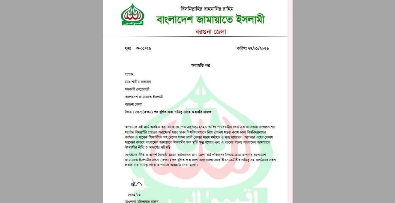 বরগুনা জেলা জামায়াতে ইসলামীর যুগ্ম সাধারণ সম্পাদক শামীম আহসানকে দলের সকল পদ থেকে অব্যাহতি দেওয়া হয়েছে। একই সঙ্গে তার দলীয়