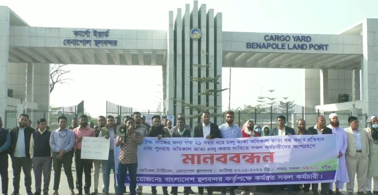 দীর্ঘ ২১ বছর ধরে চলে আসা ‘অধিকার ভাতা’ বন্ধের প্রতিবাদে বেনাপোল স্থলবন্দরে মানববন্ধন ও কর্মবিরতি পালন করেছেন বন্দর কর্মচারীরা। মঙ্গলবার