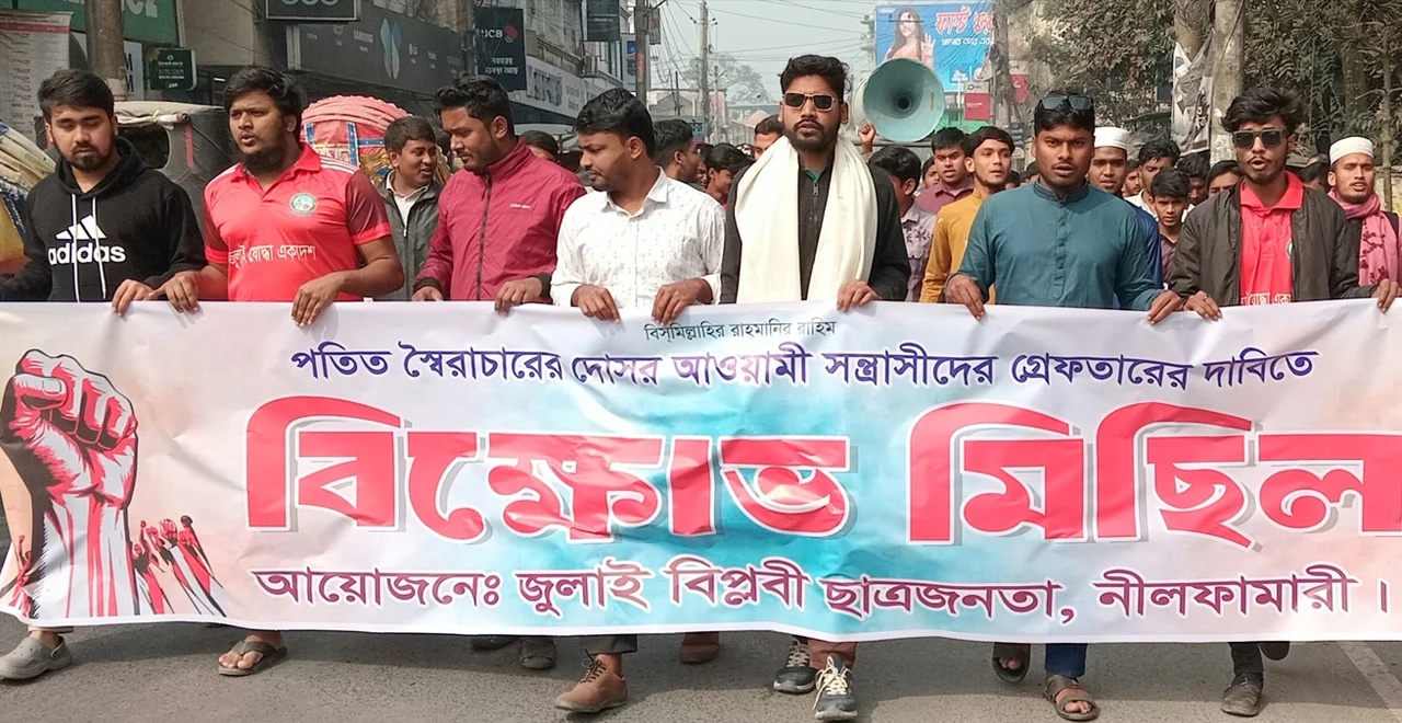 আওয়ামী সন্ত্রাসীদের গ্রেপ্তারের দাবিতে নীলফামারীতে বিপ্লবী ছাত্রজনতার বিক্ষোভ