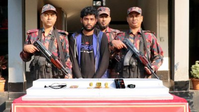 যশোরে প্রায় এক কোটি টাকা মূল্যের ৫১৫ দশমিক ৯ গ্রাম ওজনের তিনটি স্বর্ণের বার ও গহনাসহ চোরাকারবারি বিকাশ কুমার ঘোষকে