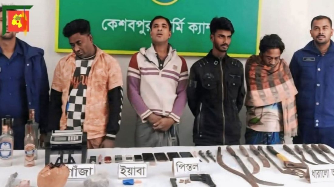 যৌথবাহিনী অভিযানে যশোরের কেশবপুর পৌর স্বেচ্ছাসেবকদলের আহ্বায়ক জাহাঙ্গীর হোসেন পলাশসহ চার জন আটক হয়েছেন। ওই সময় বিদেশি পিস্তল, ধারালো অস্ত্র