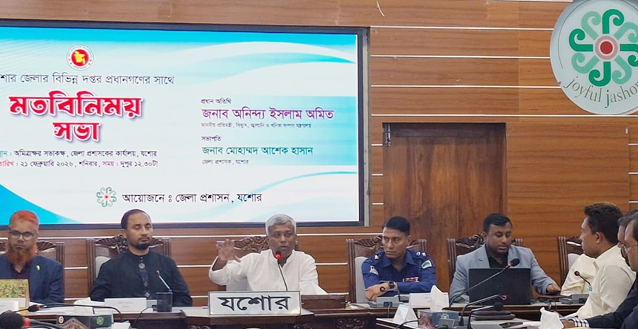 যশোরে সরকারি দপ্তরপ্রধানদের সঙ্গে মতবিনিময় সভায় বিদ্যুৎ, জ্বালানি ও খনিজসম্পদ মন্ত্রণালয়ের প্রতিমন্ত্রী অনিন্দ্য ইসলাম অমিত সরকারি কর্মকর্তাদের প্রতি কঠোর নির্দেশনা