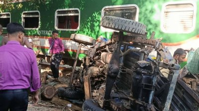 রেললাইনে বিকল পিকআপ, ট্রেনের ধাক্কায় উড়ে গেলো ২০ গজ
