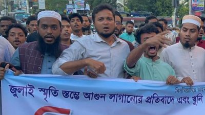 ফেনীতে জুলাই স্মৃতিস্তম্ভে আগুন, প্রতিবাদে বিক্ষোভ
