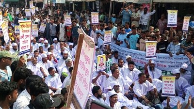 দিনাজপুরে বিএনপির প্রার্থীর নাম বাতিলের দাবিতে কাফনের কাপড় পরে মিছিল