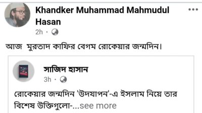 বেগম রোকেয়া সাখাওয়াত হোসেনকে ‘কাফির-মুরতাদ’ বলে মন্তব্য করেছেন রাজশাহী বিশ্ববিদ্যালয়ের এক শিক্ষক। মঙ্গলবার (৯ ডিসেম্বর) সকালে অন্য একজনের একটি পোস্ট