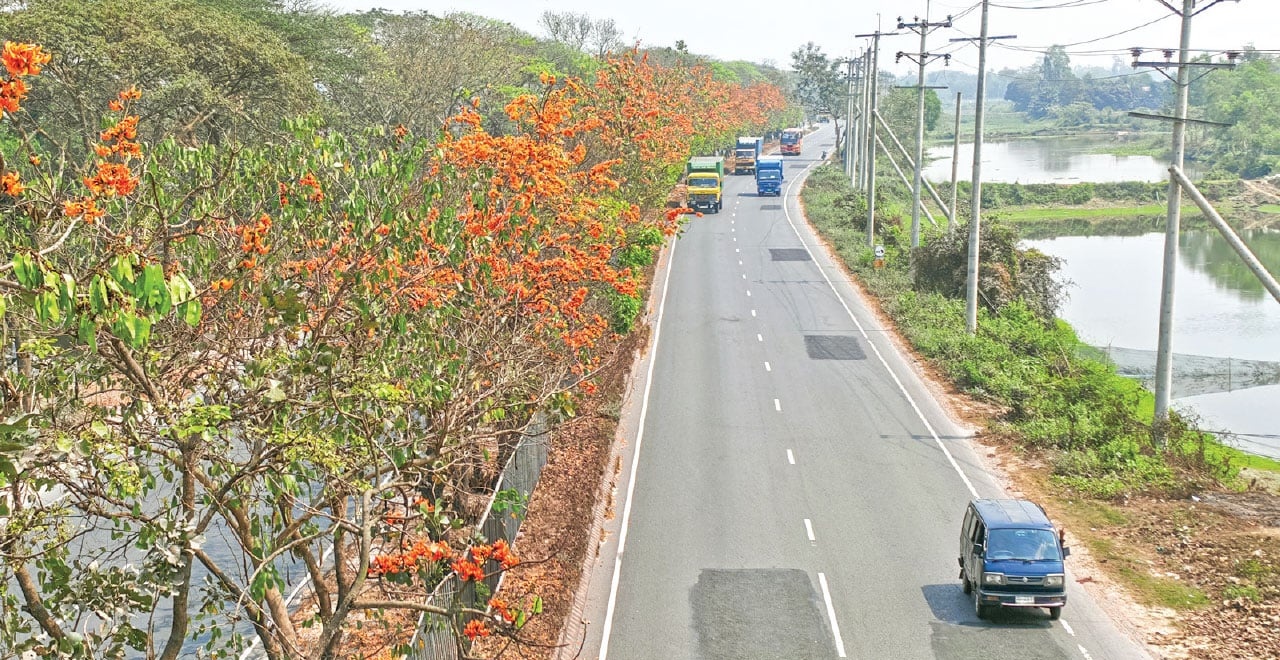 ঋতুরাজ বসন্তের আগমনে দেশের প্রধান লাইফলাইন ঢাকা-চট্টগ্রাম মহাসড়ক এখন এক অনন্য রূপ ধারণ করেছে। মহাসড়কের বিভাজকে ফুটে থাকা রক্তরাঙা পলাশ