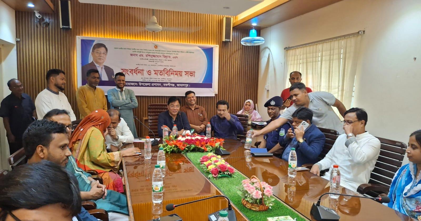 জামালপুরের বকশীগঞ্জ উপজেলায় স্থানীয় প্রশাসন ও কর্মকর্তা-কর্মচারীদের সঙ্গে এক মতবিনিময় সভায় বেসামরিক বিমান পরিবহন ও পর্যটন মন্ত্রণালয়ের প্রতিমন্ত্রী এম রশিদুজ্জামান