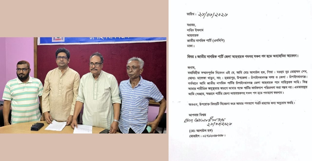 জাতীয় নাগরিক পার্টি (এনসিপি) এর চাঁপাইনবাবগঞ্জ জেলা শাখার আহ্বায়ক আলাউল হকসহ চারজন শীর্ষ নেতা দলীয় পদ থেকে পদত্যাগ করেছেন। বৃহস্পতিবার