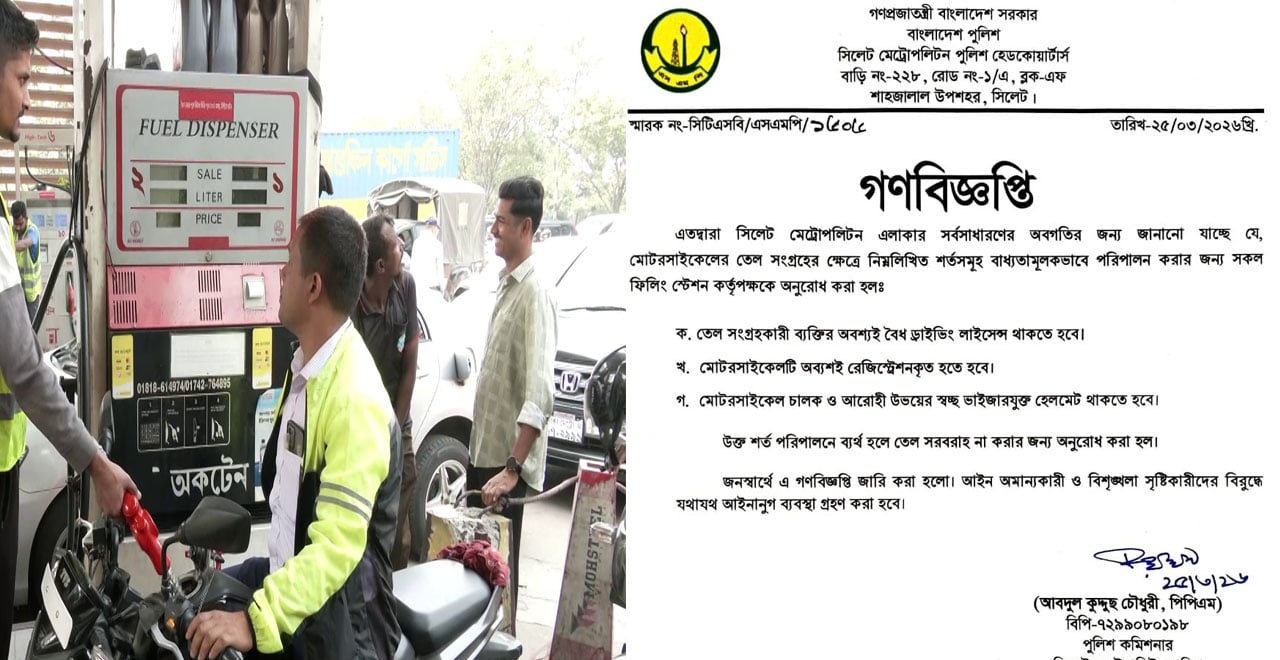সিলেটে মোটরসাইকেলে জ্বালানি তেল পেতে মানতে হবে ৩ শর্ত, পুলিশের কঠোর নির্দেশনা