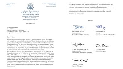 বাংলাদেশে অন্তর্বর্তী সরকারের প্রতি অবাধ, সুষ্ঠু ও অন্তর্ভুক্তিমূলক নির্বাচন নিশ্চিত করার আহ্বান জানিয়েছেন যুক্তরাষ্ট্রের কংগ্রেসের কয়েকজন প্রভাবশালী সদস্য। একইসঙ্গে আসন্ন