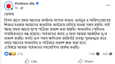 পত্রিকা প্রকাশ করতে না পারা ও অনলাইন পোর্টাল বন্ধ থাকায় পাঠকদের কাছে দুঃখপ্রকাশ করেছে প্রথম আলো কর্তৃপক্ষ। শুক্রবার (১৯ ডিসেম্বর)