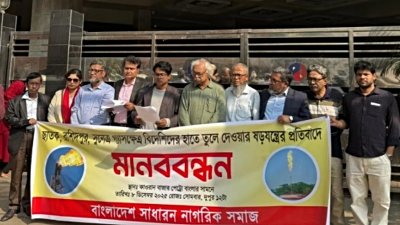 দেশের গ্যাসক্ষেত্র বিদেশি কোম্পানিকে দেওয়ার “ষড়যন্ত্রের” প্রতিবাদে মানববন্ধন করেছে বাংলাদেশ সাধারণ নাগরিক সমাজ। সোমবার (৮ ডিসেম্বর) পেট্রোবাংলা ভবনের সামনে আয়োজিত