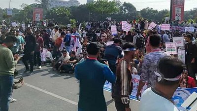 ন্যাশনাল ইকুইপমেন্ট আইডেনটিটি রেজিস্ট্রার (এনইআইআর) ব্যবস্থার সংস্কারসহ কয়েকটি দাবি তুলে বাংলাদেশ টেলিযোগাযোগ নিয়ন্ত্রণ কমিশন (বিটিআরসি) ভবন ঘেরাও কর্মসূচি পালন করছেন