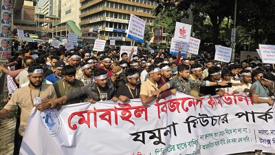 কারওয়ান বাজারে মোবাইল ফোন ব্যবসায়ীদের মানববন্ধন