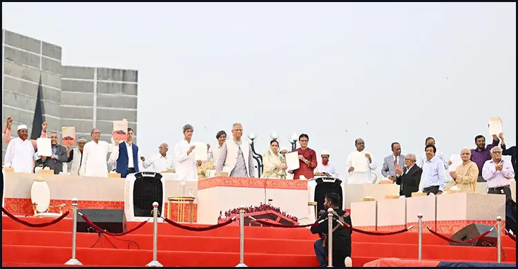 ঐতিহাসিক ‘জুলাই জাতীয় সনদ’-এ স্বাক্ষর করেছেন অন্তর্বর্তী সরকারের প্রধান উপদেষ্টা ড. মুহাম্মদ ইউনূস এবং দেশের বিভিন্ন রাজনৈতিক দলের শীর্ষস্থানীয় নেতারা।