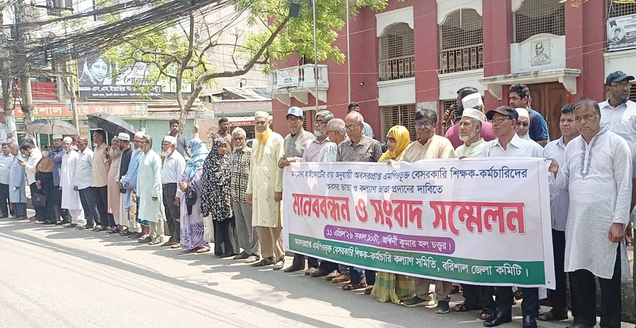 উচ্চ আদালতের নির্দেশনা সত্ত্বেও দীর্ঘ সাত বছর ধরে অবসর ও কল্যাণ ভাতা না পাওয়ায় বরিশালে বিক্ষোভ ও মানববন্ধন করেছেন কয়েকশ