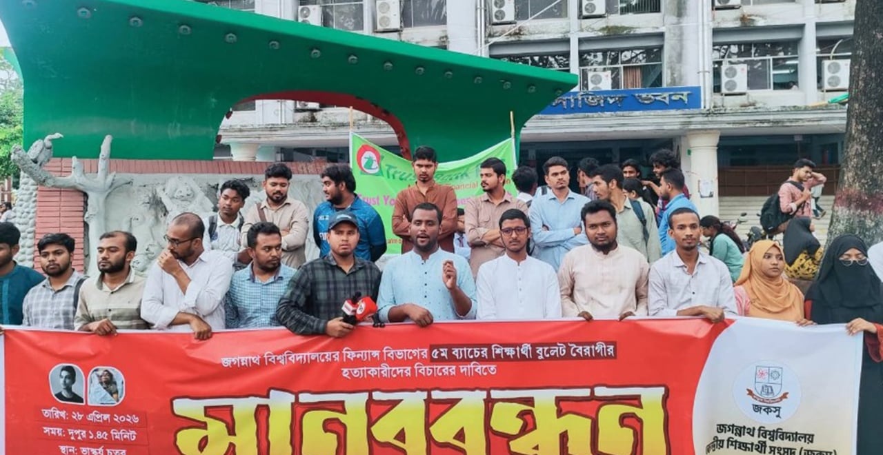 জগন্নাথ বিশ্ববিদ্যালয়ের ফিন্যান্স বিভাগের প্রাক্তন শিক্ষার্থী ও কাস্টমস কর্মকর্তা বুলেট বৈরাগীর নৃশংস হত্যাকাণ্ডের প্রতিবাদে এবং খুনিদের দ্রুত গ্রেফতারের দাবিতে মানববন্ধন করেছে জগন্নাথ বিশ্ববিদ্যালয় কেন্দ্রীয় ছাত্র সংসদ (জকসু)। মঙ্গলবার বিশ্ববিদ্যালয়ের ভাস্কর্য চত্বরে আয়োজিত এই কর্মসূচিতে বিশ্ববিদ্যালয়ের সাধারণ শিক্ষার্থী ও বিভিন্ন ছাত্র সংগঠনের নেতাকর্মীরা সংহতি প্রকাশ করেন।