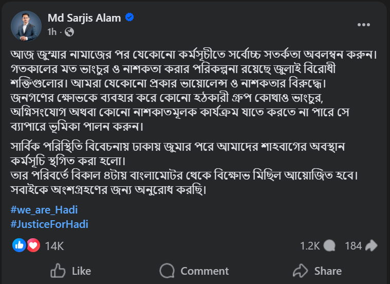 শুক্রবার (১৯ ডিসেম্বর) জুমার নামাজের পর যেকোনো কর্মসূচিতে সর্বোচ্চ সতর্কতা অবলম্বনের আহ্বান জানিয়েছেন জাতীয় নাগরিক পার্টির (এনসিপি) উত্তরাঞ্চলের মুখ্য সংগঠক সারজিস আলম। দুপুরে নিজের ভেরিফায়েড ফেসবুক পেজে দেয়া এক পোস্টে এই আহ্বান জানিয়েছেন তিনি।