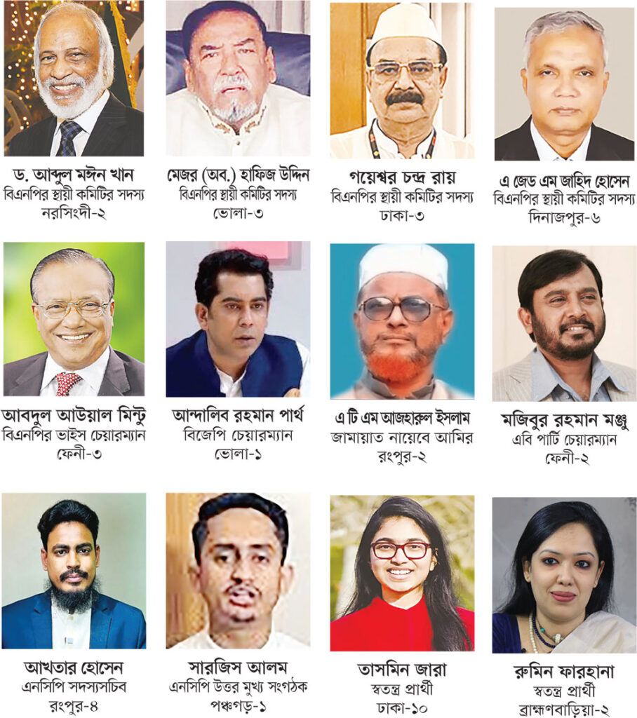 নির্বাচনী মাঠে এনসিপির শীর্ষ নেতাদের উপস্থিতিও বেশ নজরকাড়া। ঢাকা-১১ আসন থেকে নাহিদ ইসলাম, পঞ্চগড়-১ আসন থেকে সারজিস আলম এবং কুমিল্লা-৪ আসন থেকে হাসনাত আবদুল্লাহ নির্বাচনে অংশ নিচ্ছেন। ঢাকা-১০ আসনে স্বতন্ত্র প্রার্থী হিসেবে লড়ছেন তাসনিম জারা। এছাড়া ঢাকা-১৩ আসনে মাওলানা মুহাম্মাদ মামুনুল হক, ফেনী-২ আসনে মজিবুর রহমান মঞ্জু এবং রংপুর-৩ আসনে জি এম কাদেরের মতো প্রভাবশালী প্রার্থীরা নিজ নিজ আসনে প্রতিদ্বন্দ্বিতা করছেন। হবিগঞ্জ-১ আসনে ড. রেজা কিবরিয়া, ব্রাহ্মণবাড়িয়া-২ আসনে রুমিন ফরহানা এবং ব্রাহ্মণবাড়িয়া-৬ আসনে জোনায়েদ সাকির অংশগ্রহণ নির্বাচনের লড়াইকে আরও উত্তপ্ত করে তুলেছে।