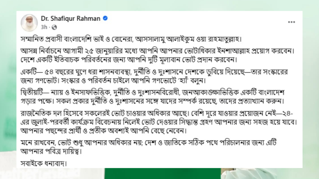 আসন্ন ত্রয়োদশ জাতীয় সংসদ নির্বাচনে প্রবাসী বাংলাদেশিদের ভোটাধিকার প্রয়োগের প্রাক্কালে এক গুরুত্বপূর্ণ বার্তা দিয়েছেন বাংলাদেশ জামায়াতে ইসলামীর আমির ডা. শফিকুর রহমান। বৃহস্পতিবার (২২ জানুয়ারি) রাতে নিজের ভেরিফায়েড ফেসবুক পেজে দেওয়া এক স্ট্যাটাসে তিনি ভোটারদের প্রতি আহ্বান জানান যে, ভোট দেওয়ার আগে চব্বিশের জুলাই গণ-অভ্যুত্থান পরবর্তী সময়ে রাজনৈতিক দলগুলোর কর্মকাণ্ড নিবিড়ভাবে মূল্যায়ন করা উচিত। তিনি বলেন, কোন দল বা প্রার্থী সংকটের সময় জনগণের পাশে দাঁড়িয়েছে এবং কারা সংস্কার ও পরিবর্তনের পক্ষে বাস্তব ভূমিকা রেখেছে—তা বিচার করেই আগামী ২৫ জানুয়ারির মধ্যে প্রবাসীদের তাঁদের পবিত্র আমানত বা ভোট প্রদান করা উচিত।